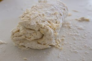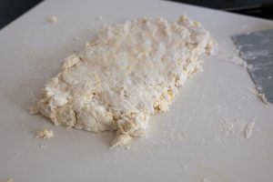 - Fold the dough in thirds and gently pat down again. Fold into thirds the other direction and pat down again. Repeat two more times for a total of four. You are not kneading this dough and you do NOT want the butter to be fully incorporated. You want to still see it in little pieces in the dough.