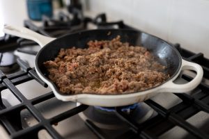 Brown the sausage in a skillet, breaking into small pieces as it cooks