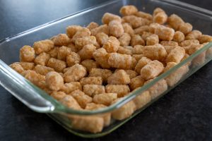 Put the tater tots in a lightly greased casserole dish, it's ok if some overlap